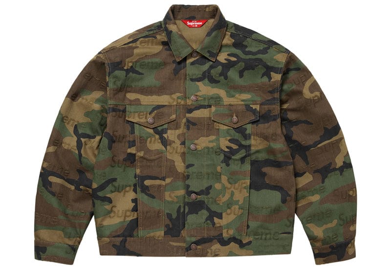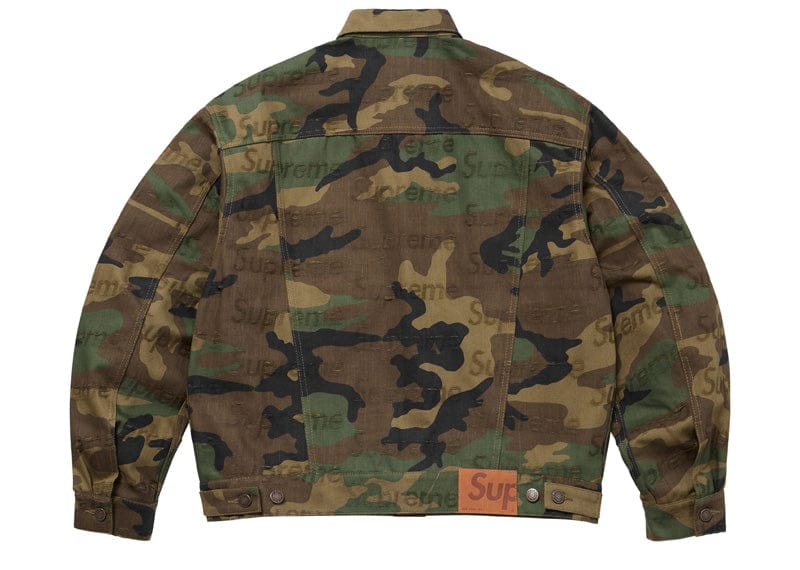 All cotton 14 oz. denim with frayed jacquard logo pattern. Button front closure with on seam hand pockets at lower front and button flap patch pockets at chest. Tab adjusters at cuffs and back hem with leather logo patch.