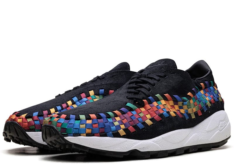 The Nike Women's Air Footscape Woven 'Rainbow' spotlights a black suede upper with woven textile paneling in a multi-hued array. Nike branding appears on the tongue and sockliner, while an embroidered Swoosh adorns the back tab. The sneaker sits atop a white Pylon midsole with Air-sole cushioning in the heel. Underfoot, the black rubber outsole utilizes a waffle traction pattern for optimal grip.