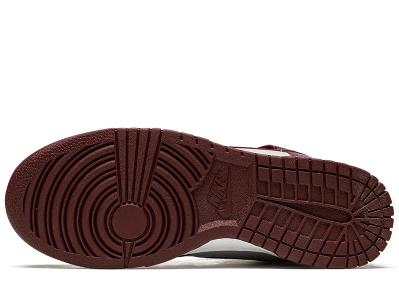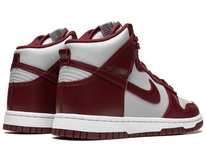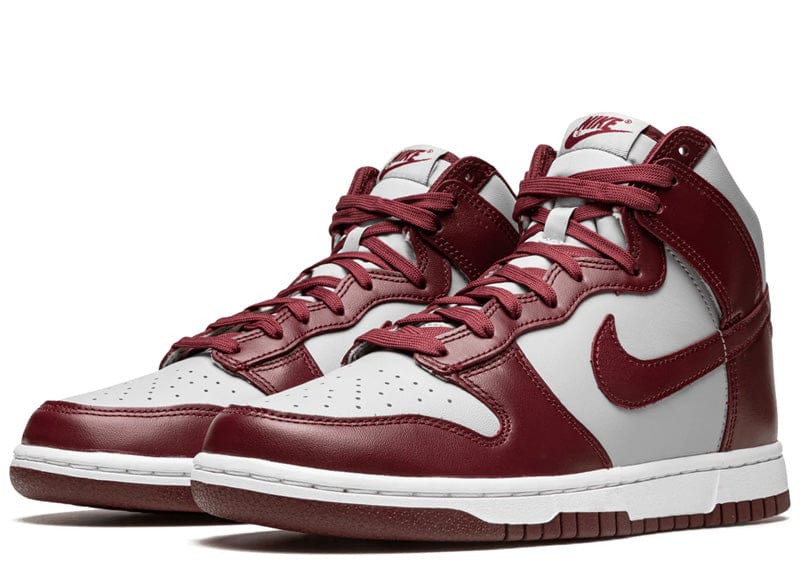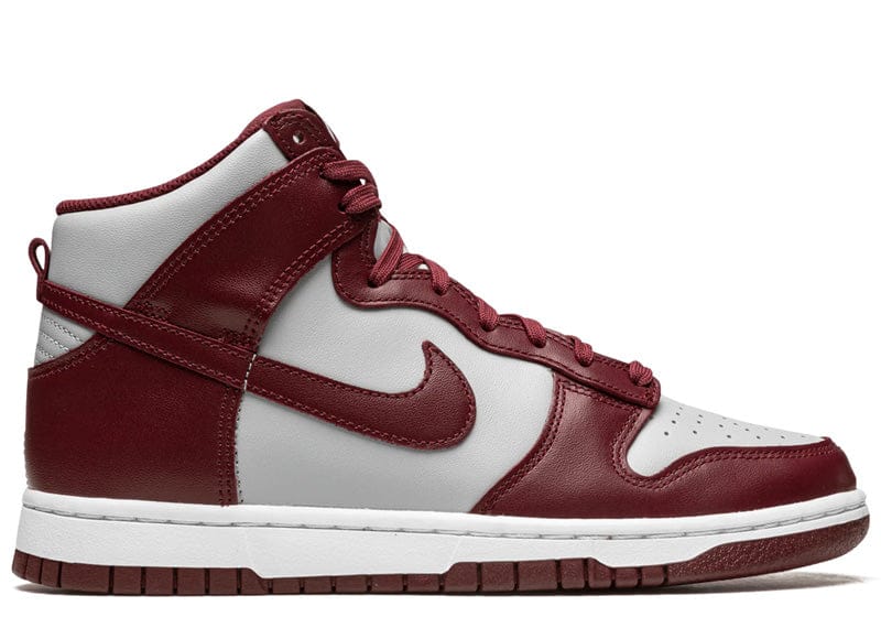 The Nike Dunk High Dark Beetroot has a burgundy-colored sole with a white midsole. The base of the shoe is a cool grey. There are wine-colored details on the toe, side panels, heel, and tongue, including the famous Nike Swoosh symbol.