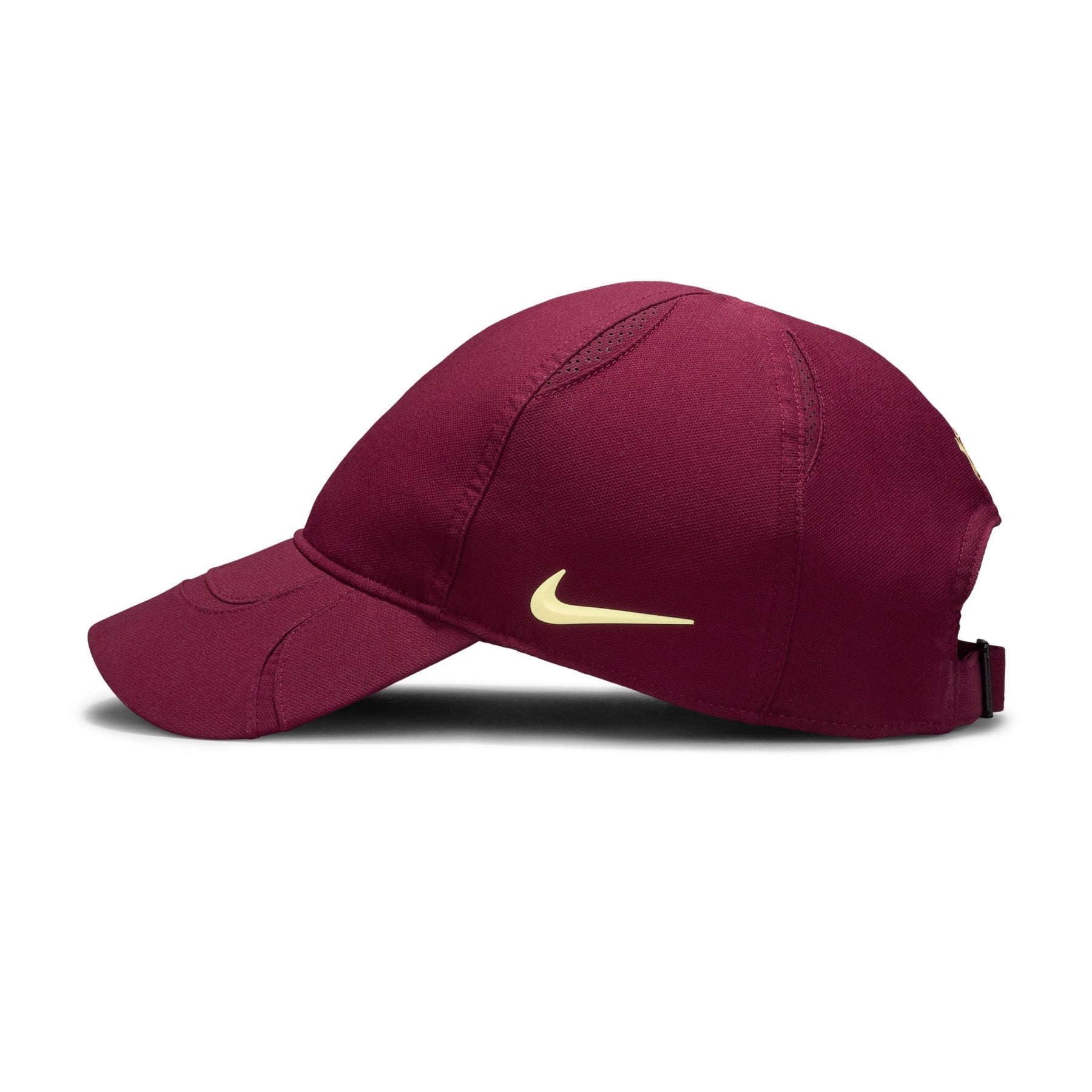 The Nike x NOCTA S.S.C. Cap combines striking visual impact with functional design. Featuring bold printed graphics and a NOCTA-branded adjustable slide, it delivers a customized fit for any wearer. Constructed from lightweight 100% polyester, this cap maintains a sleek, sporty silhouette that transitions effortlessly from court to street. The Dark Beetroot and Citron Tint colorway ensures standout presence while the refined construction reflects NOCTA's commitment to elevated essentials. Perfect for those seeking distinctive headwear with authentic athletic credibility.