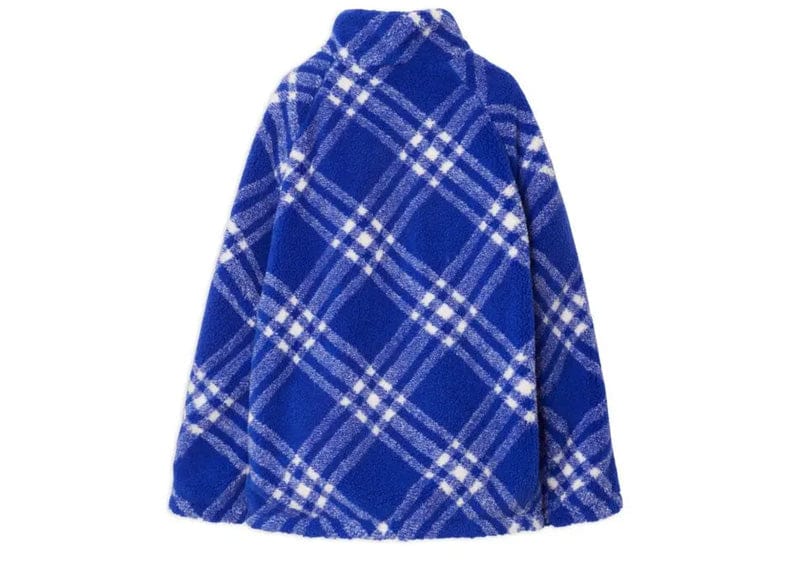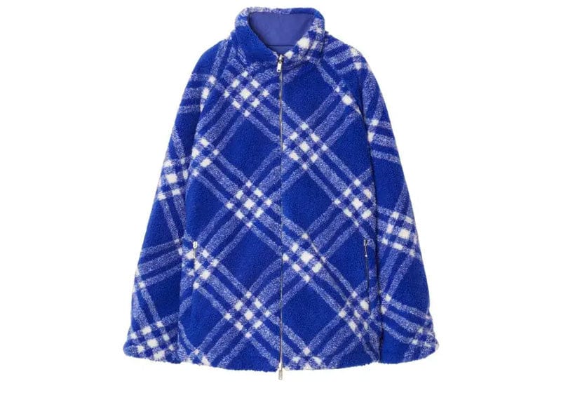 Crafted from premium fleece with Burberry's iconic check pattern in cobalt blue and white, this jacket delivers both sophistication and comfort. The funnel neck provides refined coverage, while long sleeves ensure warmth through layering. Two-way zip fastening offers versatile styling—wear it fully closed for structured elegance or partially open for a relaxed aesthetic. Dual zip pockets keep essentials secure, and the straight hem maintains a polished silhouette. An essential piece for the discerning collector who values heritage design and functional luxury.