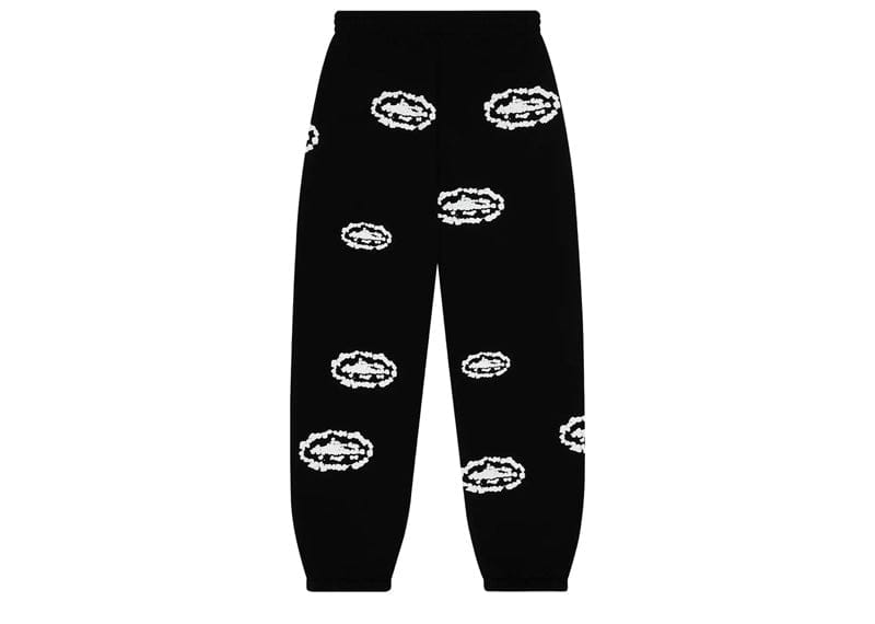 Corteiz x Denim Tears Island Wreath Sweatpants in black feature striking white wreath prints that command attention. Designed for everyday wear, these sweatpants offer a comfortable fit with an elasticated waistband and adjustable drawcord for a customized feel. The cuffed ankles provide a clean silhouette that pairs seamlessly with your favorite sneakers, making them a versatile addition to your casual wardrobe.