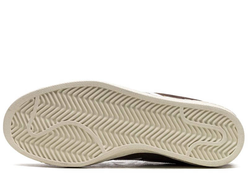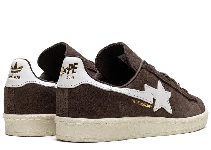 Introducing the adidas Campus 80s Bape 30th Anniversary Brown—a remarkable collaboration between the iconic German sneaker brand and the renowned Japanese streetwear giant, A Bathing Ape. This special edition sneaker reimagines the classic adidas Campus 80s silhouette to honor Bape's 30th anniversary. The Bape 30th Anniversary iteration is crafted with a rich brown suede upper, extending to the eyestays, tongue, rope laces, and leather sockliner. A smooth white leather tab elegantly accents the heel, while the upper sits atop an off-white cupsole that features herringbone traction on the outsole, ensuring durability and style. This collaboration showcases clever dual branding elements. The lateral side panel is adorned with a white leather Bape shooting star alongside gold A Bathing Ape branding, while the medial side features adidas' signature three stripes and Campus branding. On the heel tabs, Babe Sta branding in gold appears on one, with adidas trefoil branding on the other. The lace jewel and tongue tag commemorate this significant 30th anniversary milestone. Released on July 1, 2023, the adidas Campus 80s Bape 30th Anniversary Brown is a must-have for sneaker enthusiasts and collectors alike who appreciate the blend of iconic design and innovative streetwear flair.