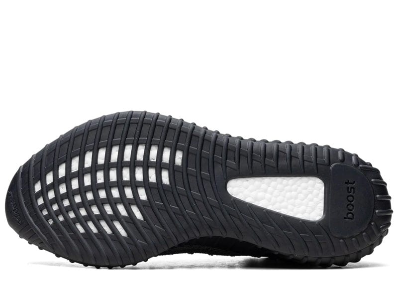 The adidas Yeezy 350 V2 CMPCT Slate Onyx features a PrimeKnit canvas characterized by a combination of black and gray tones, all of which sit atop a black sole equipped with cushioning Boost technology.