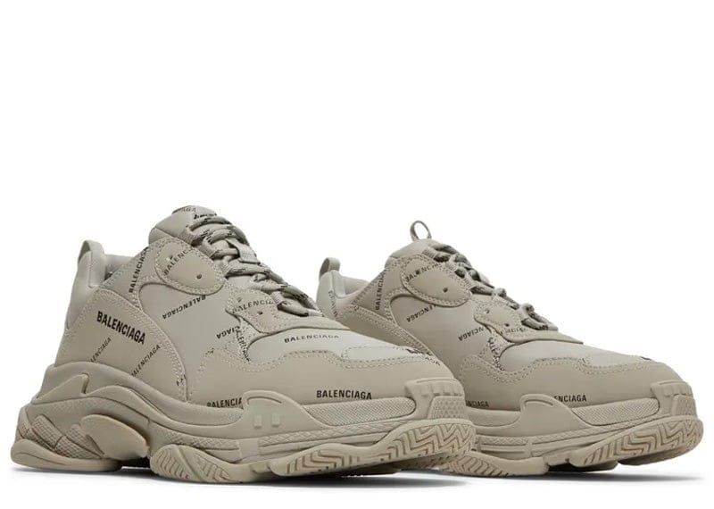 Introducing the Balenciaga All Over Logo Triple S in an eye-catching Beige and Black colorway. This contemporary design showcases Balenciaga's signature chunky silhouette, elevating your style game with its bold presence. The shoe features an intricate all-over logo pattern that blends seamlessly with the Beige and Black hues, making a statement wherever you step. Released on September 15, 2021, this model continues to embody the fusion of luxury and streetwear that Balenciaga is renowned for. Perfect for fashion enthusiasts seeking to add a distinctive touch to their footwear collection, the Triple S is a must-have addition that combines comfort, trendsetting design, and iconic branding.