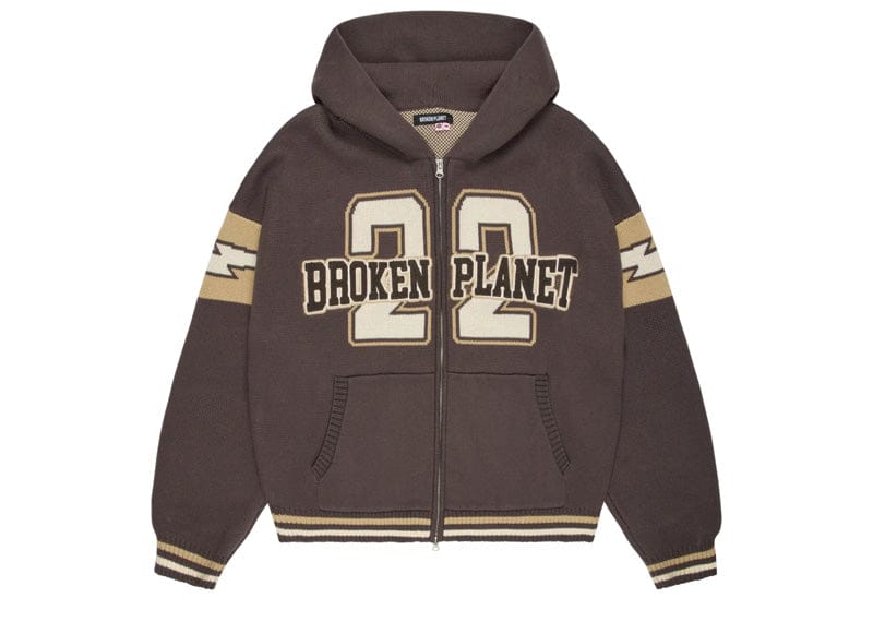 Elevate your casual wardrobe with this Broken Planet varsity knit zip-up hoodie in rich chocolate brown. Crafted from premium knit fabric, it delivers both comfort and contemporary style with its structured varsity aesthetic. The full zip closure offers versatile layering options, while the refined colorway pairs effortlessly with your everyday essentials. Perfect for those who appreciate designer-quality basics that transition seamlessly from relaxed weekends to curated streetwear moments. A timeless piece that anchors any luxury casual collection.