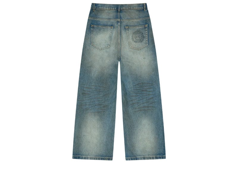The Broken Planet Wide-Leg Denim Jeans in light blue offer a bold, street-savvy look crafted from 15oz organic cotton denim for durability and comfort. Featuring the iconic embossed sun logo and signature star studs, each pair is uniquely finished with natural tears, discoloration, and markings. The relaxed fit and exclusive washed appearance make these jeans a standout piece that combines style and resilience for everyday wear.