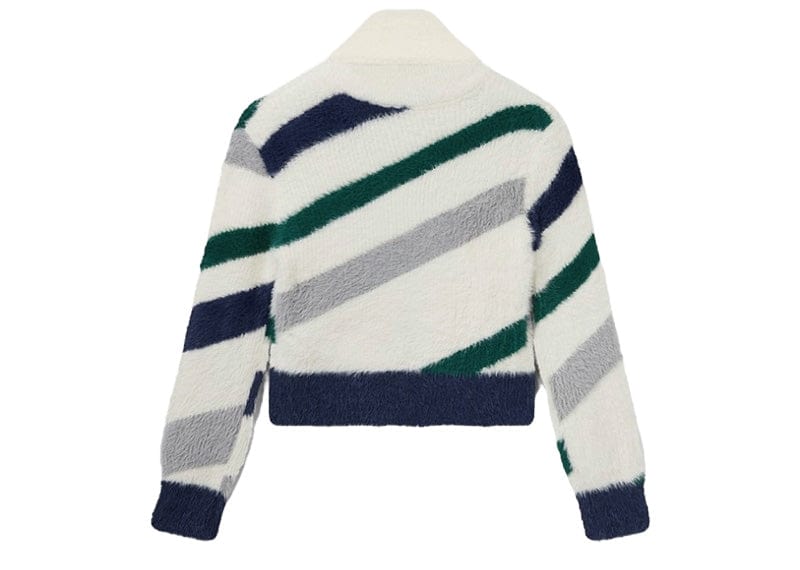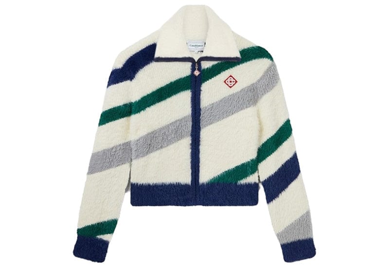 Experience cozy sophistication with the Casablanca Striped Fluffy Zip Up Jumper. Crafted from a soft knitted cotton blend, it features striking diagonal stripes and the iconic diamond logo for a distinctive look. The rib funnel collar and contrasting rib details on the cuffs, hem, and placket ensure a comfortable, polished fit. Designed to fit true to size and finished in vibrant white and multicolour tones, this jumper is perfect for effortless style. Specialised dry clean only to maintain its plush texture and vibrant colours. Made in China with attention to quality.