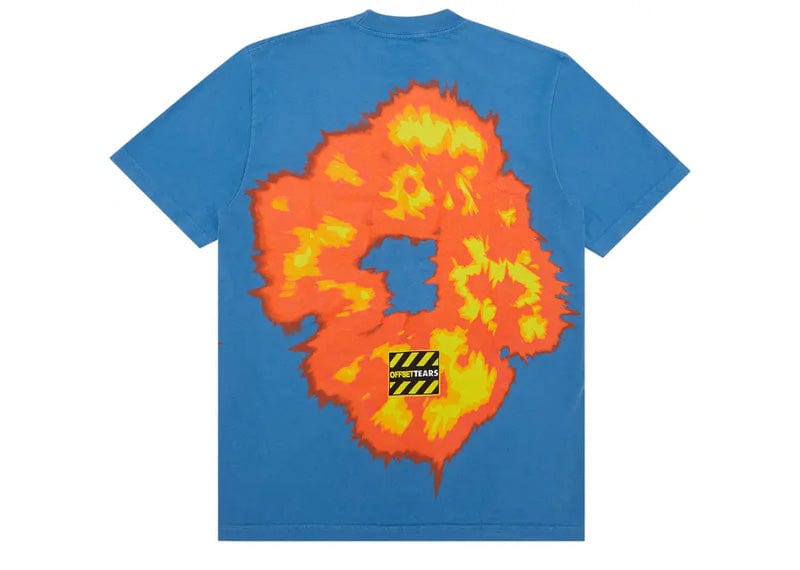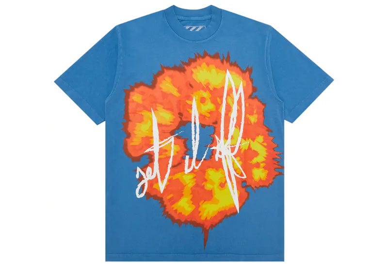 This iteration of the Denim Tears x Offset Set It Off #1 T-shirt comes in a mild blue colorway. The front of the shirt features a yellow and orange wreath that looks like a ring of fire that takes up the whole torso. "Set it off" is written diagonally in white cursive from the bottom to the top of the shirt over the wreath. On the back of the t-shirt, you can find another giant wreath, while Offset Tears branding appears in a small yellow and black striped box at the bottom in the middle.