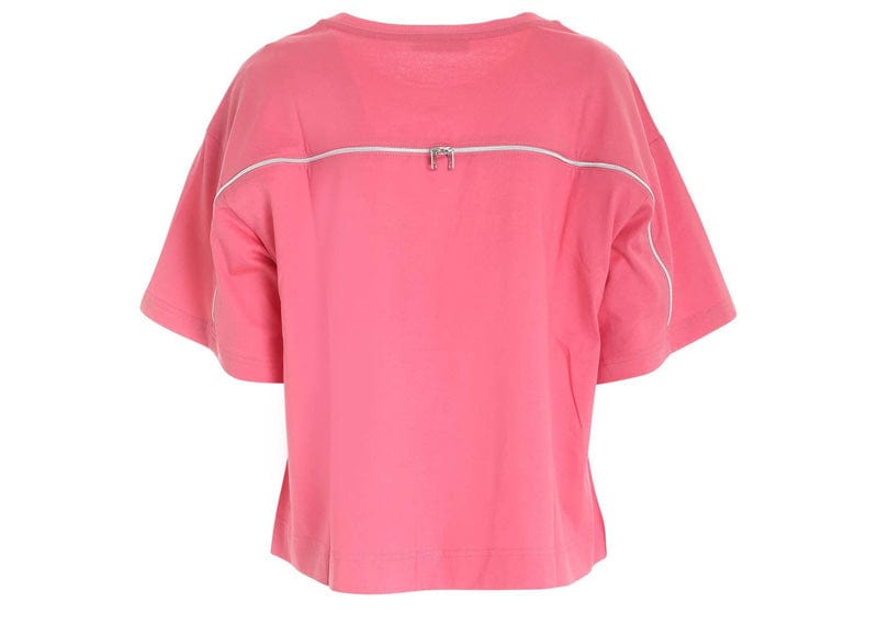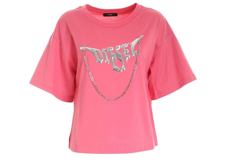 Crafted from soft and comfortable cotton fabric, the Diesel T-Bowly Tee in pink offers a boxy, cropped silhouette with short sleeves and dropped shoulder seams. The reverse features a visible zipper detail, while the front boasts an embossed Diesel branding with chain detail. Elevate your casual wardrobe with this stylish tee.