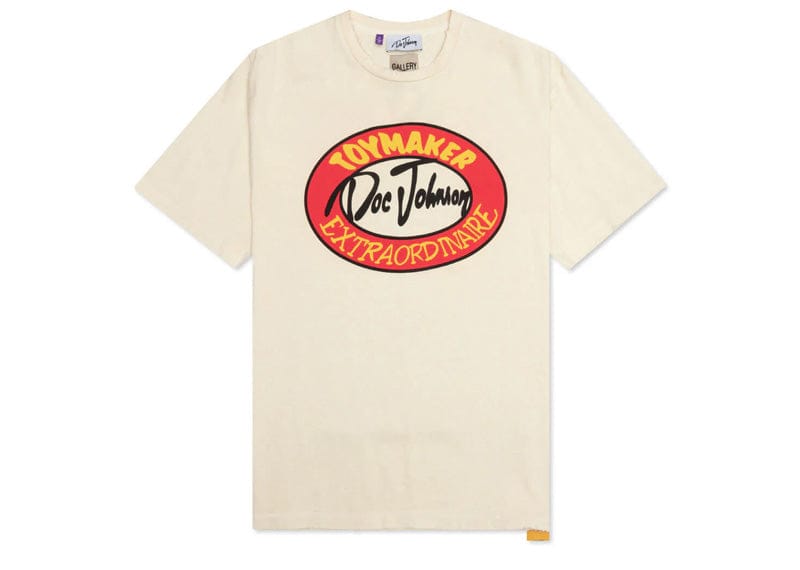 Elevate your casual wardrobe with the Gallery Dept. Toymaker Doc Johnson Tee in Antique White/Cream. Crafted from premium cotton, this statement piece combines understated luxury with bold artistic expression. The crew neckline provides classic structure, while striking screen-printed branding and graphics across the front and back showcase Gallery Dept.'s signature design aesthetic. Perfect for those who appreciate designer streetwear that commands attention without compromise.