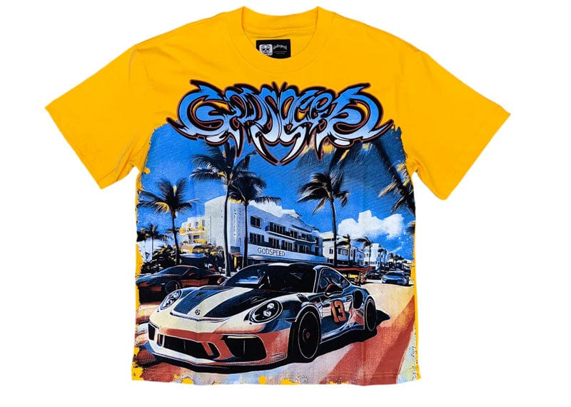 This Godspeed Car Meet Miami T-shirt in vibrant yellow is made from durable 10oz mid-weight washed fabric, offering comfort and long-lasting wear. Featuring a bold digital art design, each shirt is part of a limited edition of only 555 units and includes a numbered tag that guarantees its exclusivity. Perfect for car enthusiasts who want to stand out with unique style and authenticity.