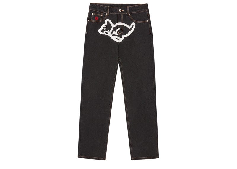 Elevate your style with these running puppy jeans from ICECREAM, created by Pharrell Williams and Nigo. Made from durable cotton denim, they feature a straight leg fit and playful graphics like the running puppy motif on the front and branded details on the back. Stand out in these unique, stylish jeans.