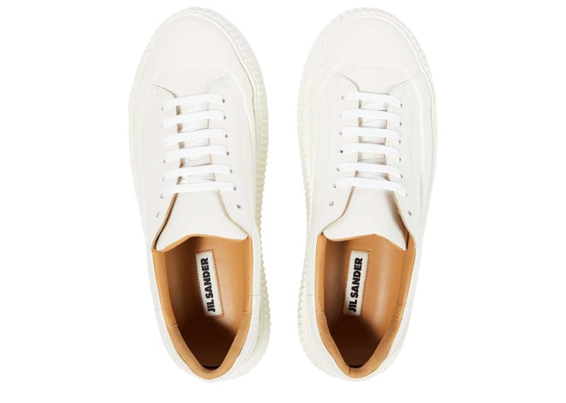 Jil Sander's leather flatform sneaker merges contemporary design with everyday comfort. Built on a commanding voluminous sole, this white silhouette features supple leather construction and a distinctive ribbed midsole that signals the brand's forward-thinking approach to footwear. A statement piece that elevates casual styling while delivering the wearability serious sneaker enthusiasts demand.