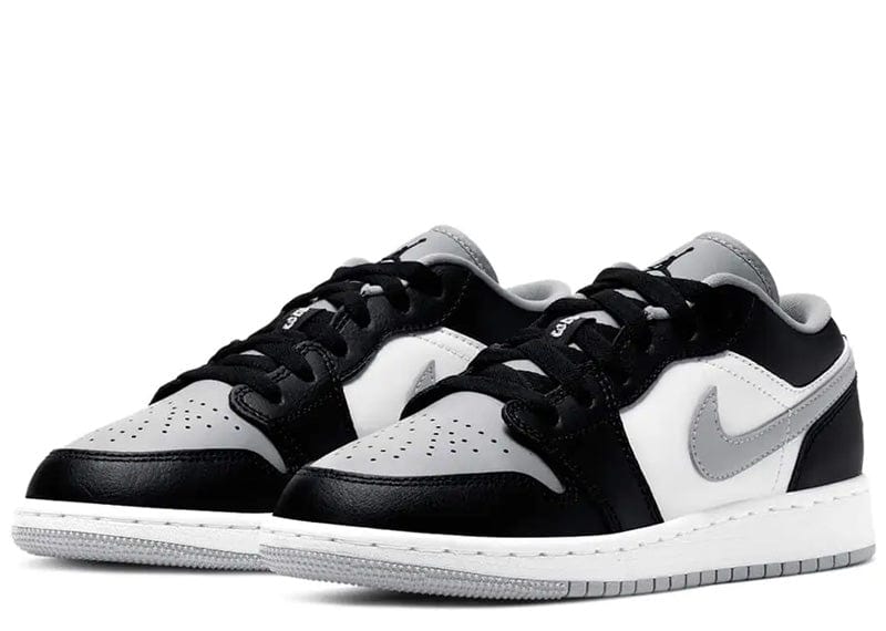 The kids Jordan 1 Low Grey Toe GS features a white and black leather uppers, a white logo, and grey accents that are just a few shades darker than white. On the back, the winged Nike logo completes the design.