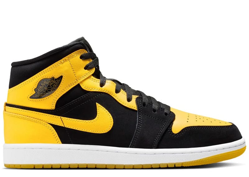 The 2025 edition of the Air Jordan 1 Mid SE 'New Love' revives one-half of the 'Old Love New Love' pack from 2007. Previously reissued as a standalone release in 2017, the mid-top employs a black nubuck upper with yellow leather construction on the toe box, eyestay, Swoosh, heel panel and collar overlay. The latter features a jeweled Wings logo, while a woven Jumpman tag adorns the tongue. A crisp white finish is applied to the midsole, fitted with encapsulated Air-sole cushioning and supported by a black rubber outsole.