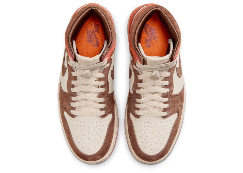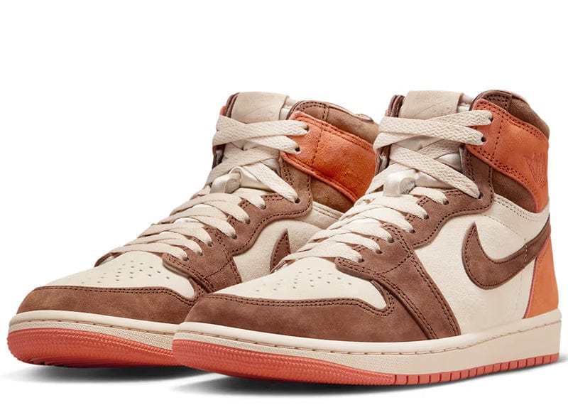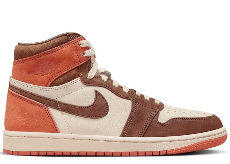 Like the original Air Jordan 1, this version boasts a high-top silhouette, perforations across the vamp, and the signature Swoosh logos on the side panels. What sets this sneaker apart is the color-blocked effect created by the Burnt Sunrise and Cacao Wow against the Dusted Clay base. Cacao Wow can be found on the mudguard, lining, collar, eyestays, and Swoosh logos. On the other hand, Burnt Sunrise is displayed around the collar, on the outsole, and across the heel panel.