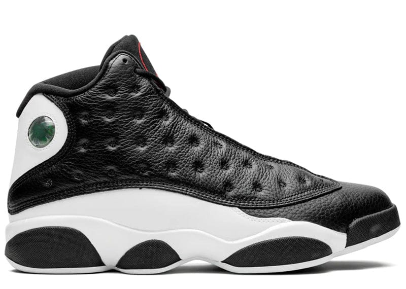 The Air Jordan 13 Retro 'Reverse He Got Game' reimagines the iconic sneaker with an inverted colorway inspired by Spike Lee's 1998 film. This mid-top features tumbled leather in classic black on the toe and side panels, contrasted with crisp white throughout the upper. A striking green holographic 'cat eye' and bold red Jumpman logo on the tongue complete the design, delivering a fresh take on a legendary silhouette.