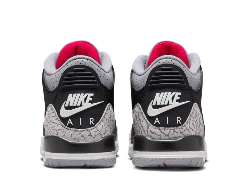 Made for big kids, the 2024 edition of the Air Jordan 3 Retro OG GS 'Black Cement' is built with tumbled black leather, featuring grey elephant print overlays at the forefoot and heel. A crimson Jumpman adorns the grey leather tongue, while the heel panel displays a raised Nike Air logo. Black detailing wraps around the heel of the white polyurethane midsole, enhanced with visible Air-sole cushioning.