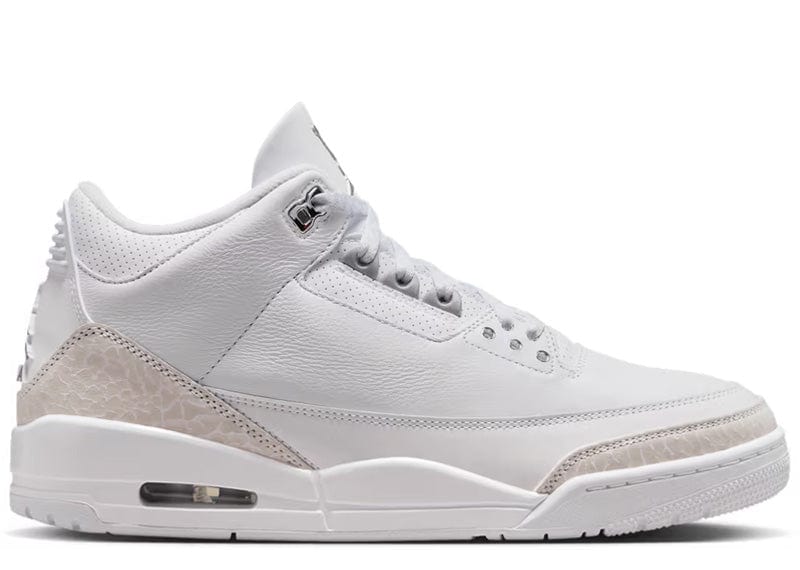 The 2025 edition of the Air Jordan 3 'Pure Money' brings back a blank-slate colorway that originally debuted in 2007. The mid-top features a white tumbled leather upper with tonal elephant print overlays at the forefoot and heel. Matte silver accents land on the molded eyelets, as well as the Jumpman branding hits that adorn the tongue and heel tab. Lightweight cushioning arrives via a white polyurethane midsole with a visible Air-sole unit nestled in the heel.