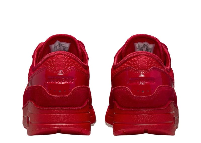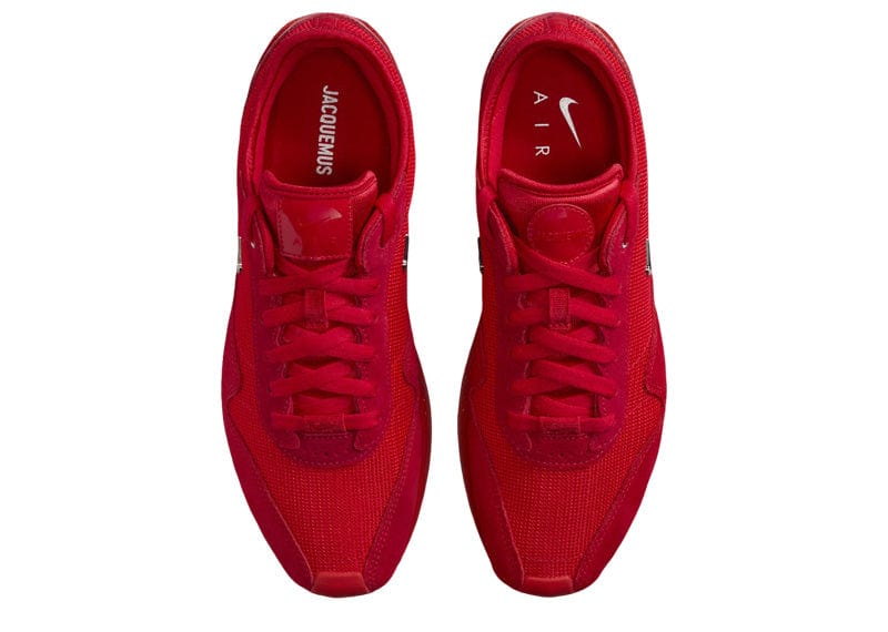 Launching as part of a three-piece footwear collaboration, the Jacquemus x Nike Women's Air Max 1 '86 'Big Bubble - Mystic Red' features a flooded crimson upper, crafted from breathable mesh with a wavy suede mudguard. Chrome accents land on the top eyelets and molded mini-Swoosh. 'JACQUEMUS' is debossed on the patent leather heel overlay, while dual branding appears on mismatched tongue tags. An elongated and rectangular Air window appears on the lateral sidewall of the matching red polyurethane midsole, supported by a rubber outsole that wraps up the toe.