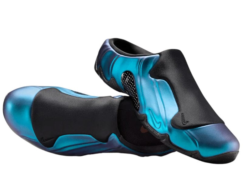 The Nike Clogposite 'Dusty Cactus' utilizes a molded Foamposite upper in an iridescent blue finish. Stretchy black textile along the vamp provides a secure and comfortable fit, while a mesh vent on the medial side panel offers enhanced breathability. The slip-on is equipped with a molded foam midsole and durable rubber outsole, featuring a wavy traction pattern for optimal grip.