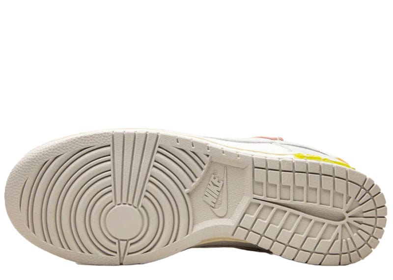 This Off-White x Nike Dunk Low is taken from the ‘Dear Summer’ collection, a sprawling follow-up to Virgil Abloh’s first Nike Dunk collaboration from 2019. The low-top makes use of a white canvas upper with soft grey leather overlays, along with Virgil Abloh’s calling-card flourishes, which include a plastic zip tie and printed Helvetica text. Contrasting pops of colour arrive via the sneaker’s secondary lacing system, zip-tie, an exposed-foam tongue and a rectangular tab affixed to the Swoosh. Limited to fifty pairs, a ’24 of 50’ badge is affixed on the lateral midsole. This pair opt for neutral toned laces with overlaying rope laces done in pink accompanied by a purple zip tie.