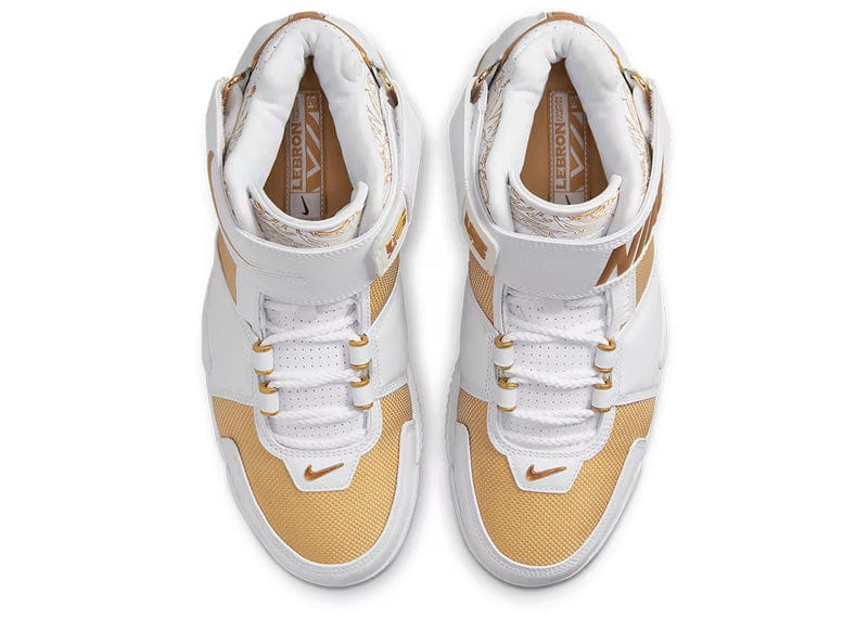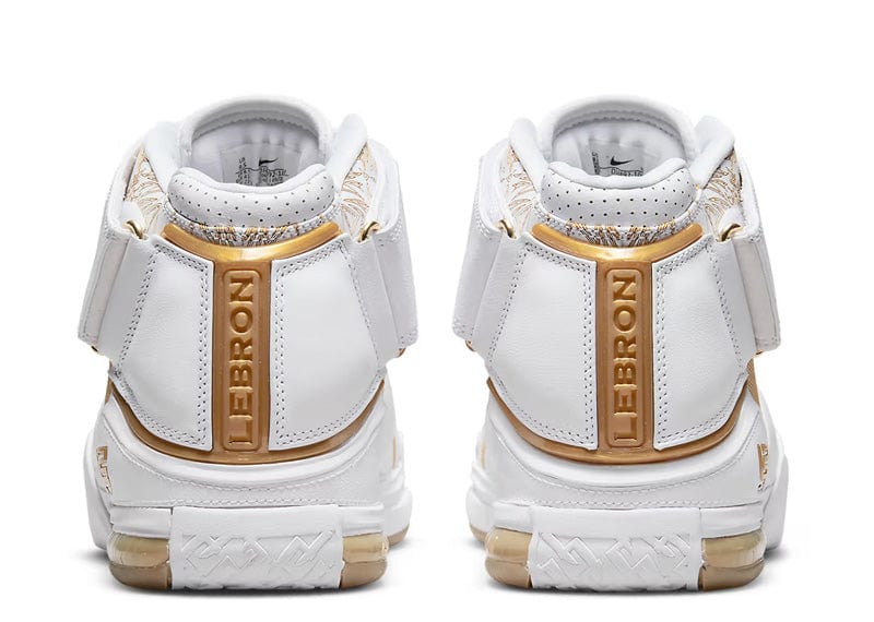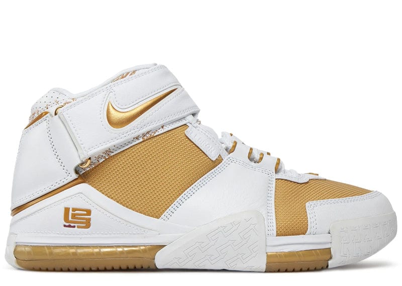 The Zoom Lebron 2 Retro 'Maccabi' 2022 pays homage to the Maccabi Tel Aviv basketball team and features white, metallic gold, and varsity crimson colorway. The shoe's upper is crafted from gold ballistic mesh, providing durability and breathability, while white leather overlays adorn the toe, midfoot, and heel for added support. The collar features a customizable strap adorned with detailed laser-engraved designs in a metallic gold color. The shoe combines advanced cushioning technology, with special air units positioned in both the front and back of the sole, protected by a strong Pebax shell. This design guarantees maximum comfort and shock absorption for high-intensity activities.