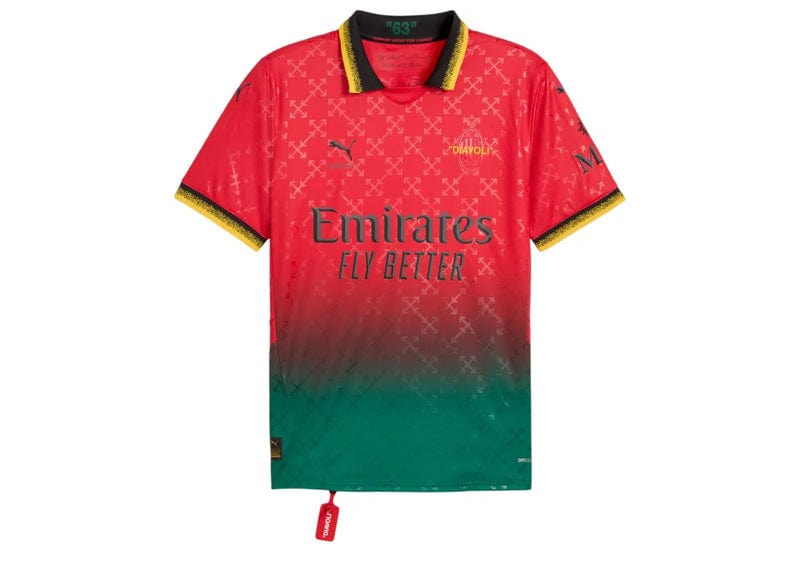 Boost your AC Milan pride with the OFF-WHITE x Puma Replica Jersey. As the team's official Style and Culture Curator, this jersey features a unique 'Arrow' print and an embroidered Milan Badge with a 'Diavolo' slogan. Designed for both style and function, be a true Rossoneri fan in this authentic 4th Goalkeeper jersey.