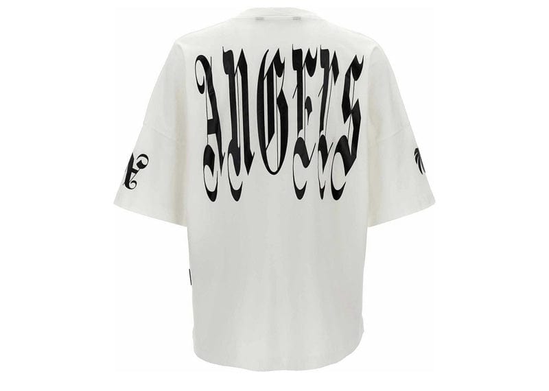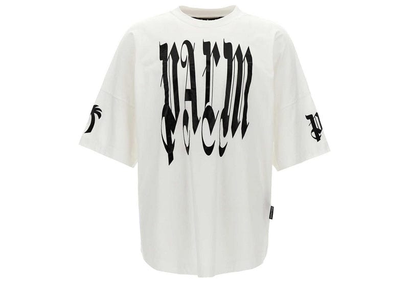 Experience edgy style with the Palm Angels Gothic Logo Over T-Shirt. Featuring a gothic palm print on the back and a logo print on the back, this crew neck tee adds a unique twist to your t-shirt collection. Made with short sleeves for comfort and style, this tee is perfect for making a statement.