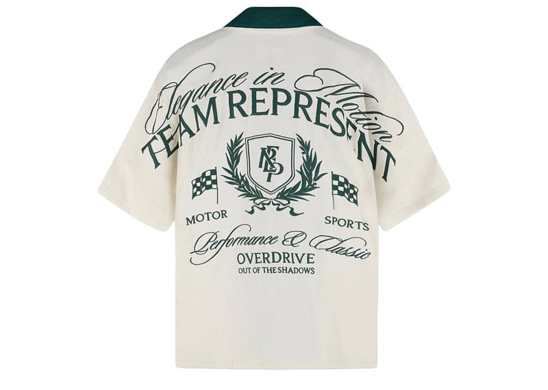 Represent Crest Shirt in Antique White combines understated sophistication with contemporary design. The lightweight, drapey fabric drapes elegantly while the contrasting forest green collar adds visual interest. Dual chest pockets provide practical functionality, while the embroidered back graphic featuring the Elegance in Motion Overdrive design delivers signature Represent styling. Short sleeves and button-front closure complete this versatile piece that transitions seamlessly between casual and refined occasions.