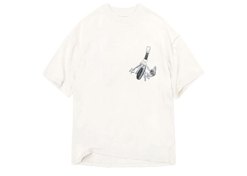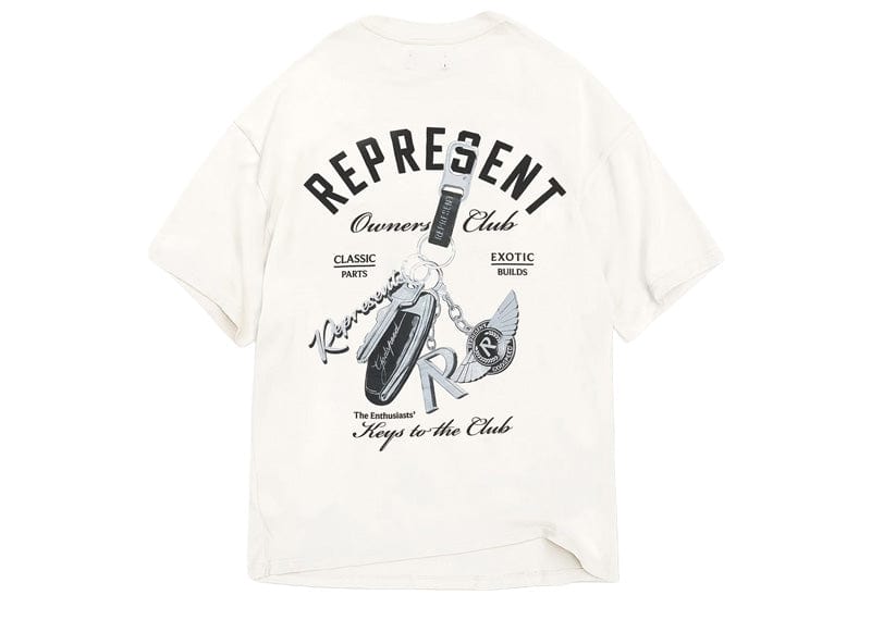 Introducing the Keys to the Club T-Shirt in Flat White, a luxury slightly oversized t-shirt crafted from medium weight cotton. The t-shirt features our overlaid rib neckline with a pearl print, puff print and screen print mix graphic. It is finished with a Represent metal bar logo to the hem.