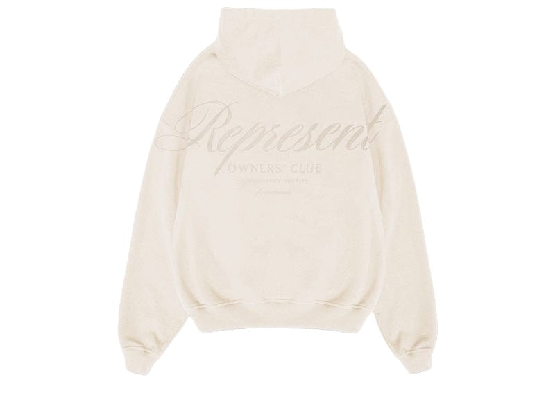 Introducing the latest evolution of the Represent Owners’ Club Hoodie in Beige, crafted from heavy weight jersey cotton with a slightly oversized fit. The hoodie features a ribbed hem and cuffs, with a Cobrax popper to the hood and Represent metal bar to the pocket.