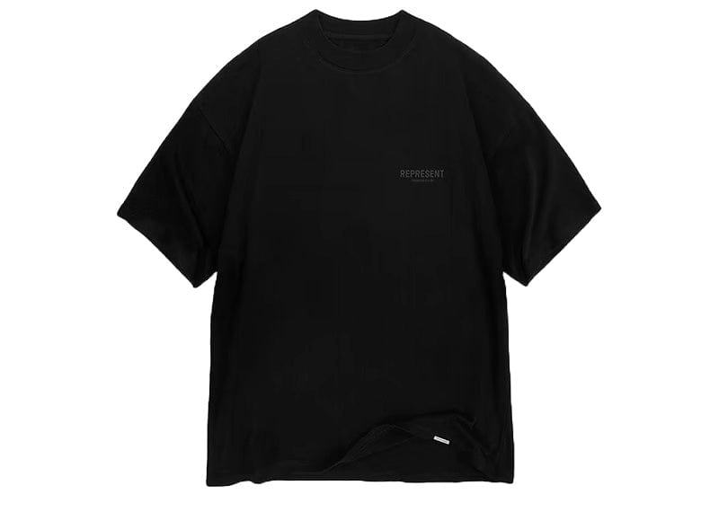 Discover the sleek and stylish Represent Owners Club T-Shirt in Matte Black. Made from medium weight cotton, this short sleeve jersey tee features a slightly oversized fit and a ribbed crewneck collar. The matte black Owners Club branding on the chest and back adds a touch of sophistication, while the Represent metal bar on the hem completes the look. Expertly crafted for a comfortable and fashionable experience.