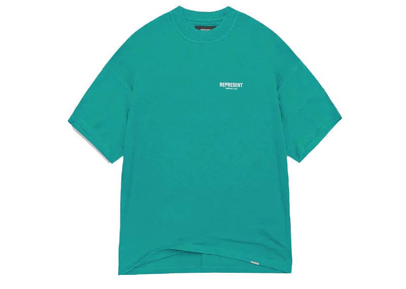 Short sleeve jersey teal t-shirt. Slightly oversized fit in a medium weight cotton. Ribbed crewneck collar. Represent Owners Club graphic branding to the rear and chest. Logo bar to the hem.