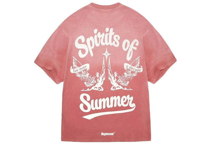 Introducing the Spirits of Summer T-Shirt in Sunrise, a luxury cotton t-shirt with a slightly oversized fit. This t-shirt is crafted with a pigment dye and spray technique, creating a gradient wash, making each piece truly unique. The t-shirt is finished with a Spirits of Summer puff print graphic to the front and back, and a Represent metal bar to the hem.