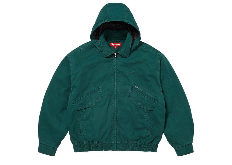 All cotton 11 oz. denim with 3M Thinsulate insulation and quilted taffeta lining. Full zip closure with welt hand pockets, snap flap hand pockets and double welt zip pocket at lower front. Interior chest pockets. Removable hood with elastic hem and snap adjusters at cuffs. Embroidered logo on chest and woven logo label on back neck tab.