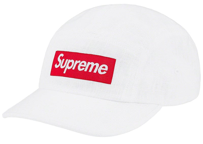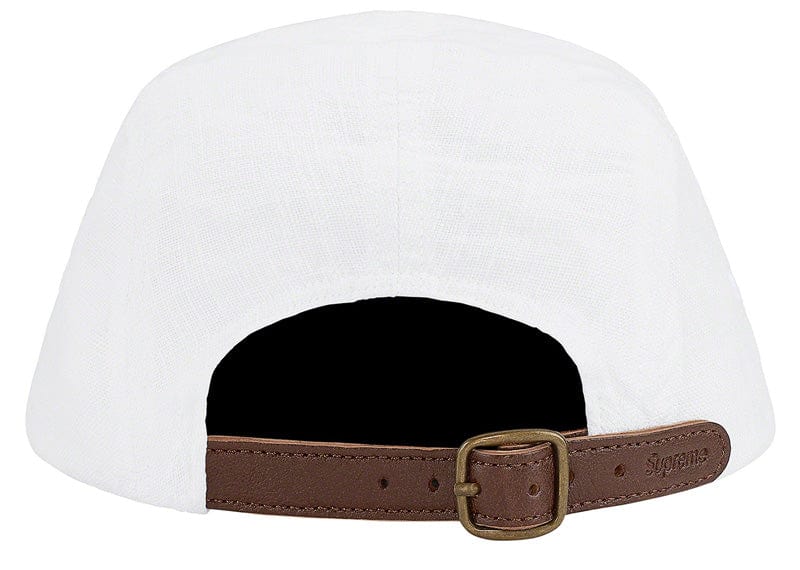 Solbiati linen Supreme camp cap with custom debossed leather strap closure.