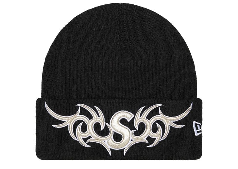 The Supreme New Era Tribal S Logo Beanie Black reworks the familiar S logo with intricate tribal inspired detailing that adds movement and texture. Set against a black knit base, the graphic feels bold yet controlled, giving the beanie a distinctive identity within the lineup. The collaboration with New Era ensures a comfortable cuffed fit that holds its shape throughout the season. It is a fresh spin on a motif that longtime fans instantly recognize.