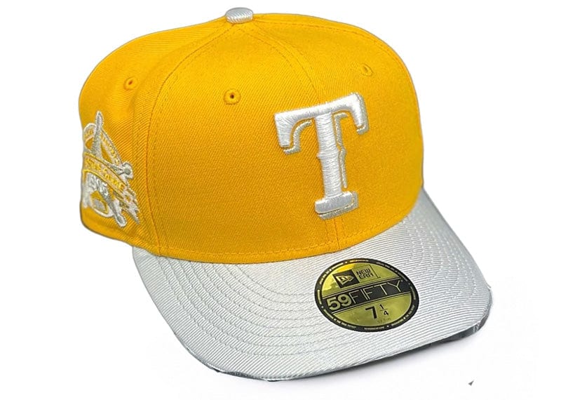 Introducing the TEXAS RANGERS YELLOW METALLIC GREY. It features a UV-resistant coating that protects against sun damage, ensuring its vibrant yellow color stays bold and bright. Perfect for any fan, this cap combines style and durability for a winning look.