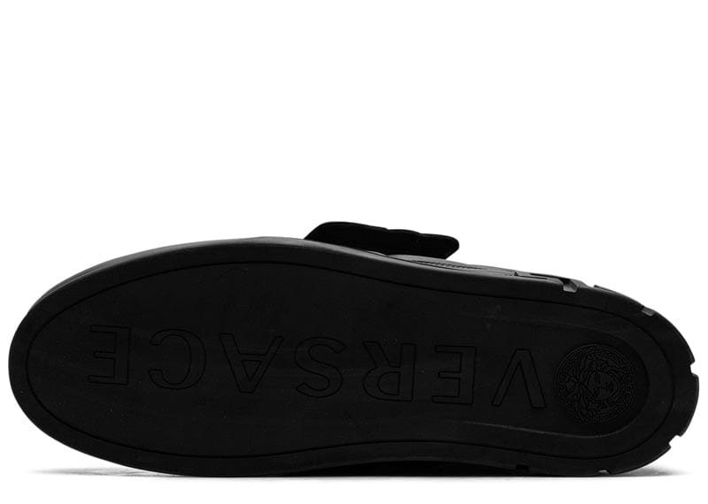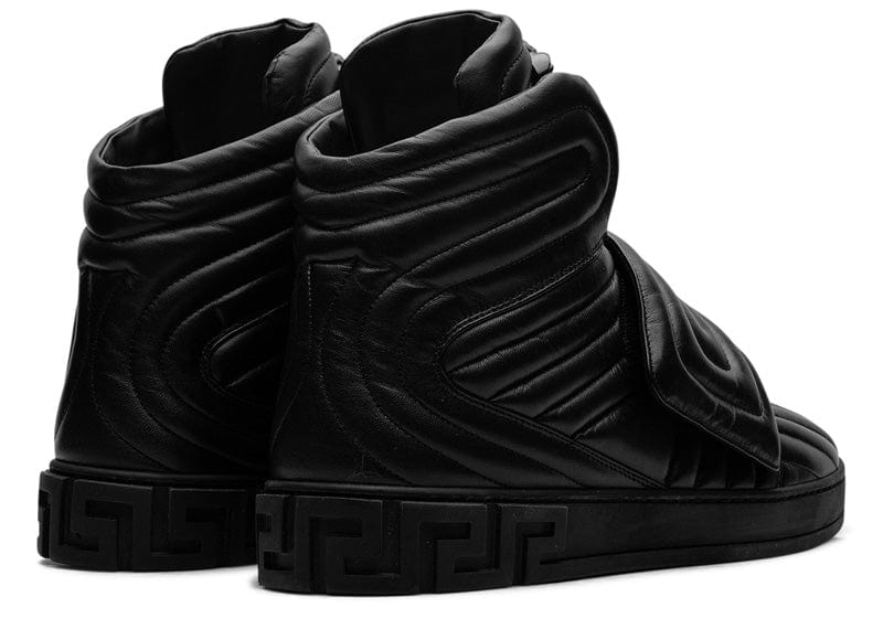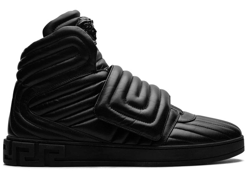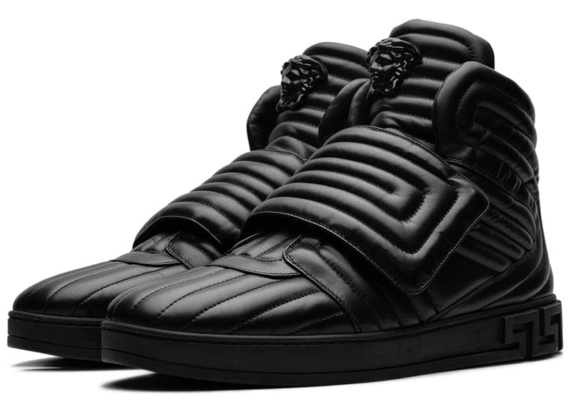 Step up your style with these Versace Black Quilted Medusa High-Top sneakers. Crafted from luxurious quilted leather, they feature a sleek round toe and a velcro strap that hides a flexible elastic gusset for easy wear. The padded tongue showcases the iconic carved Medusa emblem, while the comfortable heel collar ensures all-day support. Signature Greek key detailing wraps the midsole, paired with a tonal rubber sole and stitching for a refined, modern look. Perfect for those who want to make a bold yet sophisticated statement with every step.